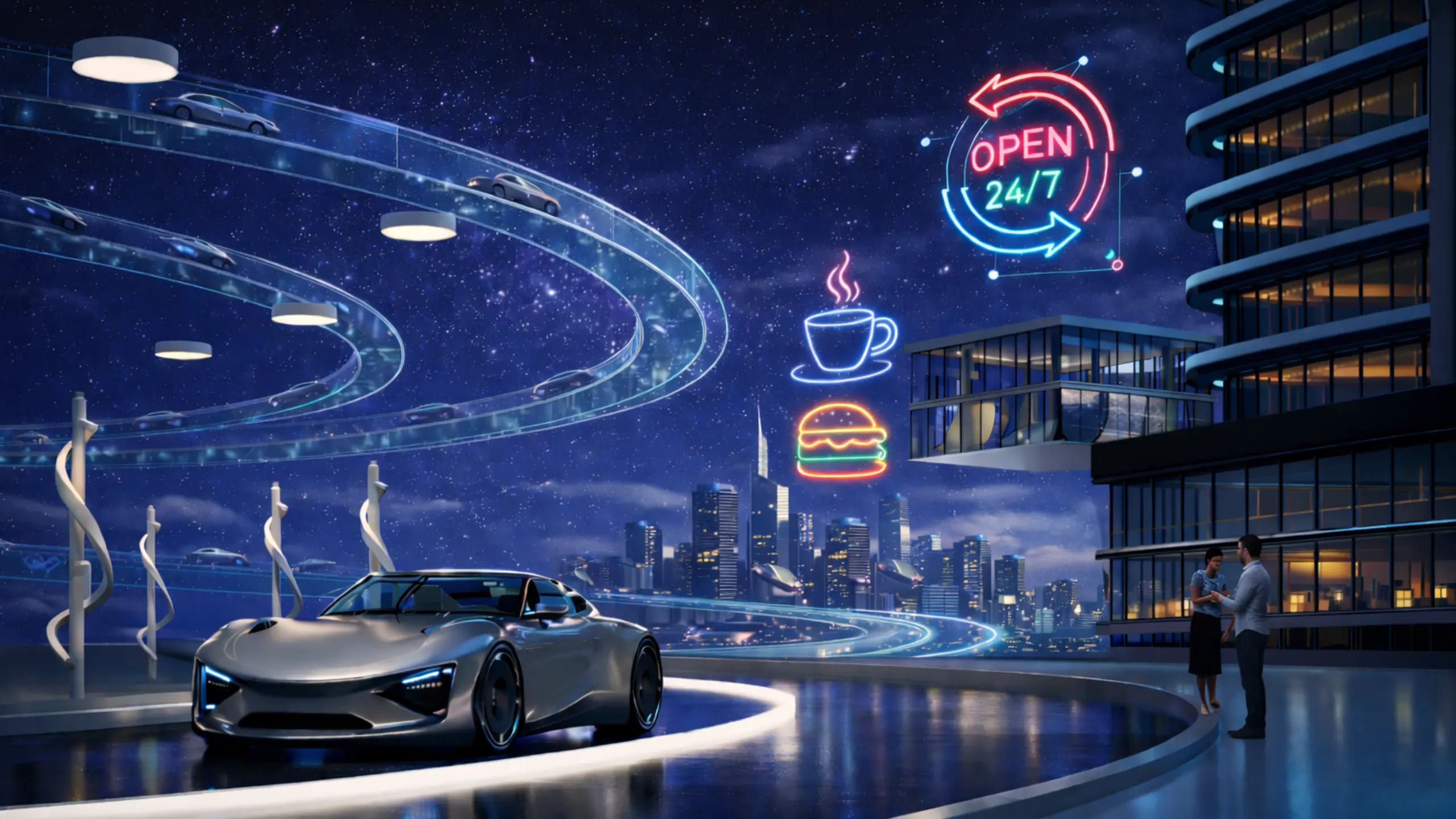 柱や壁面を透明化し、宙に浮かぶサインや透明な道路など、視線を遮らない開放的な空間を実現します。