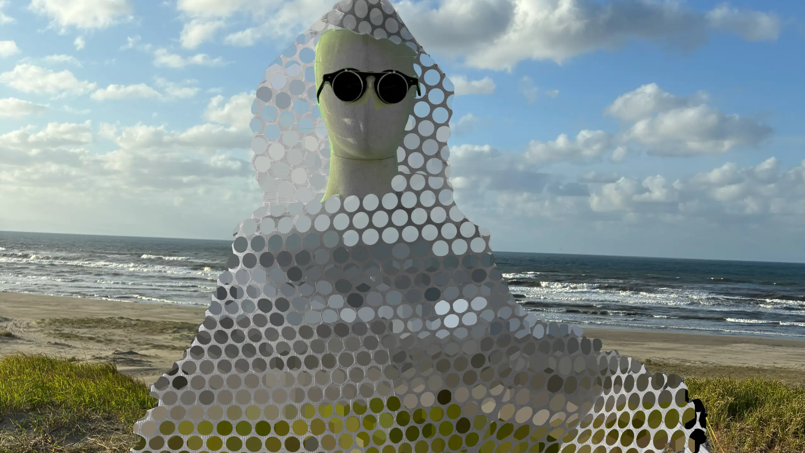 人が身にまとう装備を対象に、周囲の環境に溶け込む「透明マント」という極めて象徴的な形を通して、視認性制御技術の可能性を探っています。